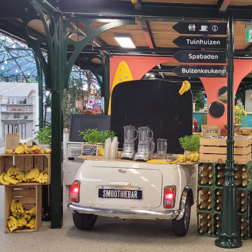 De Mini-bar bestaat uit een achterkant van een oldtimer Mini. De aanhangers kunnen ingezet worden als opvallende en unieke smoothiebars. Op de aanhanger plaatsen wij professionele blenders die de beste smoothies produceren. De Mini-bar als mobiele sapbar is een uitstekende aanvulling op de Vitamini voor extra capaciteit of als aanvulling op het assortiment van de koffie uit de Caféini. Het is ook mogelijk deze Mini-bar in te zetten als mobiele espressobar -met professionele barista- voor heerlijke koffie!